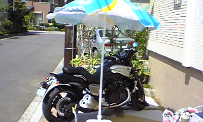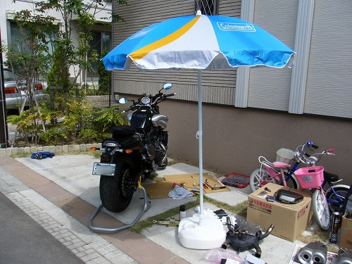 ↓我が家の青空ファクトリー。あまりの暑さにパラソル立てました・・・・