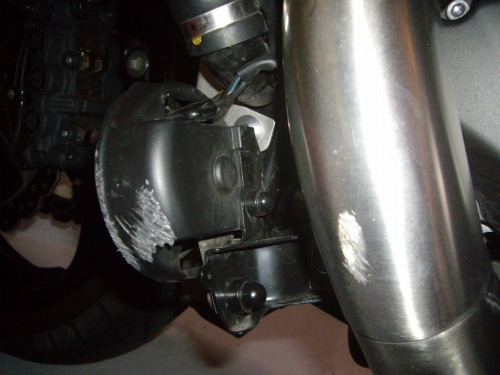 ペダルの曲がりはレンチで曲げ戻し、サイレンサーエンドカバーはとりあえず左右入れ替えで目立たなく応急処置。
