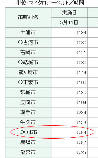 県内で最も高いもので守谷市で0.5μシーベルト以上だったとのこと。